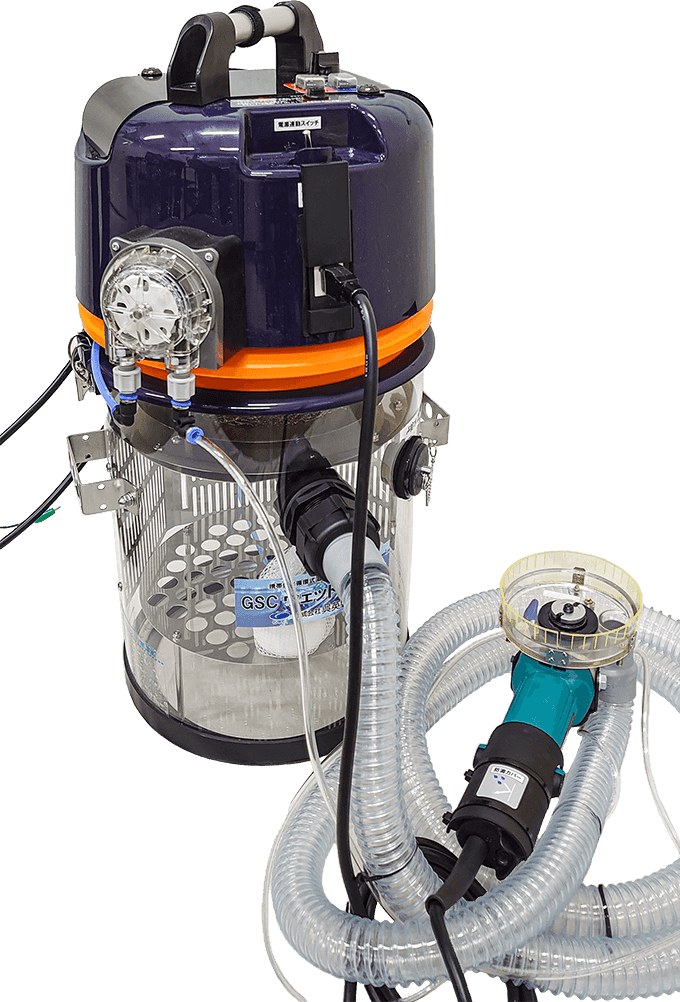 GSCウェットサンダーは、湿潤化と集塵に有効な機能を持つサンダーです。作業中に水を常時供給して粉塵の飛散を防ぎつつ、汚水を回収してろ過します。水を再利用できるため、水源のない場所での粉塵対策にも役立ちます。作業環境をクリーンに保ち、作業者の健康リスクを低減するのに有効な製品です。